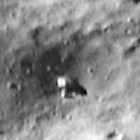 Квадраты не так легко увидеть, но различить можно. Кратер справа имеет очень необычное геометрическое образование, находящееся в середине. Объект белый, совершенно прямоугольный и отбрасывает длинную тень, как будто является отражающим зданием. Также имеется нечто вроде длинного лестничного колодца или дороги, поднимающейся к нему снизу. НАСА не скрывает совершенной геометрии: “Большой прямоугольный валун сверху справа имеет 45 м в поперечнике”.[250]