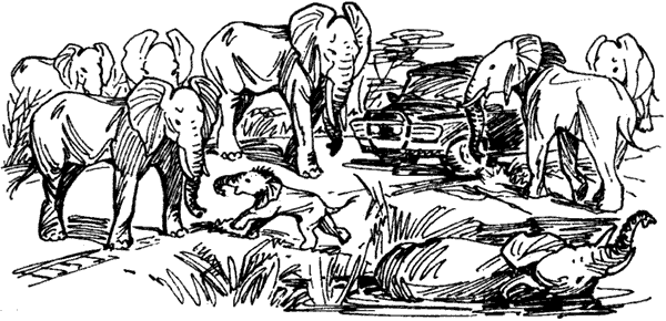 Стадо сгрудилось вокруг нас еще теснее; некоторые из слонов забрались в пруд в каких-нибудь десяти футах от нас, плескались и поливали друг друга водой, катались в грязи, не обращая на нас никакого внимания. Наши хозяева сообщили нам, что с недавних пор случаи браконьерства в Микуми резко пошли на убыль в результате введения строгого антибраконьерского режима, и у слонов постепенно возвращается доверие к человеку. Из Микуми мы вернулись воодушевленными – теперь нам было чем похвастаться, наш тяжкий труд дал реальный результат.