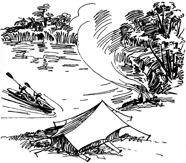 Джеральд должен был бы вернуться в Дар-эс-Салам на прививку – он только что встал на ноги после приступа малярии, – но мужественно принял решение в этот раз отказаться от вакцинации, чтобы дать нам возможность провести ночь в охотничьем домике на северо-западе заповедника. И вновь мы в полете над этой величественной страной; ориентируемся главным образом по реке Руфиджи. Пролетая над небольшим озерцом, мы заметили каноэ с двумя людьми и лагерь на берегу.