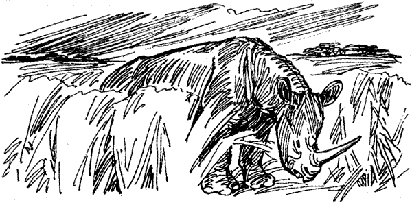 Зверь развернулся к нему с гулким, тревожным, яростным фырканьем, готовясь к бешеной атаке, а рядом с ним возник детеныш, и это был не тот носорог, черт бы его побрал! – и Томпсон обратился в бегство. Повернул кругом и бросился наутек, крича: «Не тот носорог!» – и мы вскочили, чтобы бежать к деревьям. Всеобщая суматоха, и Томпсон мчится обратно, вверх по склону, крича: «Не тот носорог!» – и позади него разъяренная носорожиха сделала ложный выпад в сторону удаляющейся поясницы Томпсона, потом развернулась и, шумно пыхтя, протопала вниз, уводя детеныша от опасности. Мы дружно расхохотались. Томпсон продолжал бежать вверх по откосу.
