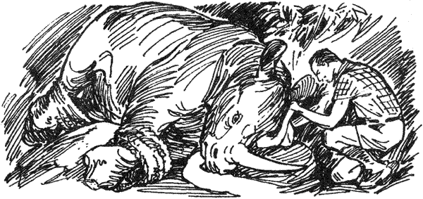 Калашака принес еще один камень и примостил его на первом. Томпсон обхватил обеими руками голову зверя, поднатужился, поднял ее, кряхтя, и Калашака добавил к «подушке» третий камень. Томпсон отпустил голову, теперь она лежала вровень с туловищем. Томпсон снял с себя шляпу и затолкал ее под голову зверя, чтобы не пострадал глаз. Носорог шумно, протяжно вздохнул с подвыванием. Он крепко спал.