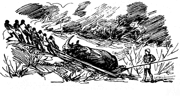Он лежал на боку, хребет упирался в край салазок. Мы опять захватили двумя веревками ноги, третьей обмотали шею и рог. Восемь человек взялись за каждую веревку, шестеро приготовились поднимать брюхо носорога. Две веревки пропустили через большие кольца на верхнем конце салазок. По шести человек держали каждую из этих веревок, чтобы не дать салазкам скользить вниз по откосу. Если носорог снова проснется, быть беде. Мы напряглись.