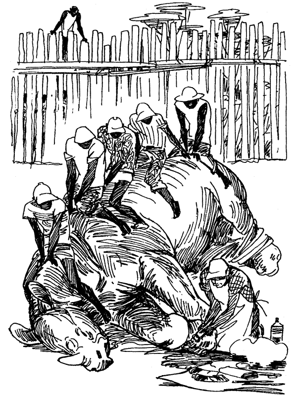Сначала Томпсон влез с обездвиживающим ружьем на ограду и всадил в носорожиху добрую дозу М-99. Зрители ликовали, и Томпсону пришлось прикрикнуть на них, чтобы не галдели: это трагедия, а не цирк. Африканцы поспешили сделать серьезные лица. Минут двадцать сидели мы на ограде, ожидая, когда носорожиха свалится, и африканцы громко выражали свое восхищение могучим зверем. Когда она затихла, мы подтянули клетку и открыли загон. Набросили на голову детеныша аркан и потащили его, скулящего и упирающегося, прочь от усыпленной матери и заперли в клетке, чтобы не мешал, и зрители снова дали волю ликованию, и Томпсону пришлось опять призывать их к порядку: дескать, тут не смеяться, а плакать надо. Затем он велел рабочим выгрести навоз из отсека. После этого помощник Джона Конди вылил на землю в отсеке несколько ведер дезинфицирующего раствора, и африканцы решили, что начинается колдовство, призванное изгнать злых духов, и все притихли, потому что со злыми духами шутки плохи. Потом задние ноги носорожихи связали веревкой. Облив дезинфицирующим раствором воспаленную переднюю ногу, Конди попросил, чтобы шесть рабочих уселись на носорожиху и прижимали ее к земле на случай, если она очнется, и зрители заметно оживились. Джон Конди расстелил на земле резиновый коврик и разложил на нем хирургические инструменты. Публика была в восторге.