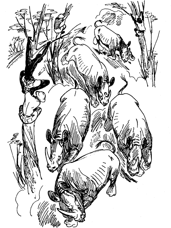 Кругом сплошь окаянные носороги, и шум травы, и топот копыт, и свирепое фырканье. Выскочив с грохотом и треском из травы, четыре фыркающих взрослых доисторических чудовища плюс носорог Ричарда пошли стометровой шеренгой в атаку прямо на нас, притаившихся в сухом русле, и мы обратились в бегство. С криком, сломя голову бросились врассыпную, черные и белые вперемежку бежали, прыгали, неслись к деревьям, одержимые самым примитивным из всех инстинктов, бежали, спотыкаясь, мчались к деревьям, и черт с ними с глазами, черт с ними с ушами, и наплевать, если кто-то упал, и ты на него наступил, только бы взобраться на окаянное дерево раньше, чем грозные рога дотянутся до твоих ягодиц. Я мчался стрелой к ближайшему дереву, и оно, как назло, было гладким, точно телеграфный столб, и на бегу я обернулся и увидел плотный строй страшных носорогов, и один особенно свирепый тяжеловес, вытянув наклоненную голову, взял прицел прямо на мое седалище, и я быстро полез по гладкому стволу. Запросто взобрался, словно белка, бодая чьи-то проворные ляжки.