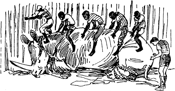 Было всего два часа пополудни, когда «мерседес» доставил нас обратно к загону в Ньямасоте. Томпсон был очень доволен Ричардом. Ричард был очень доволен самим собой. Мы все были очень довольны. Томпсон стоял на верху изгороди, опираясь на здоровую ногу, и наблюдал за действиями Ричарда в стойле. Я стоял с фотоаппаратом возле Томпсона, готовый снимать – Ричард и его первый носорог. Самец был отменный. Весь покрытый испариной, он лежал на боку, постанывая, и крепко спал, и я залюбовался им. Высота в холке – сто шестьдесят семь сантиметров, длина рога – семьдесят три сантиметра. Стало быть, он мог дотянуться рогом до высоты в два с половиной метра.