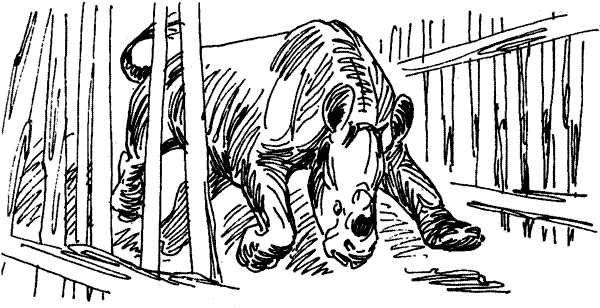Осборн снял промокшую от пота шляпу и швырнул на землю. Этот рослый, упитанный, добродушный и благодушный лысеющий мужчина сейчас был зол как черт и поведал нам о случившемся, перемежая рассказ непечатными словами. Такие-сякие веревки, которыми была привязана такая-сякая клетка, каким-то образом, трам-тара-рам, развязались, и, когда грузовик с открытыми бортами, трам-тарарам, подал кузовом в такую-сякую яму, чтобы можно было, трам-тарарам, спустить клетку к входу в загон, водитель вдруг нажал на такие-сякие тормоза, и одновременно носорог, трам-тарарам, вдруг вздумал брыкаться, и такая-сякая клетка вывалилась из кузова, трамтарарам. Я посмотрел на стоящую наклонно клетку.