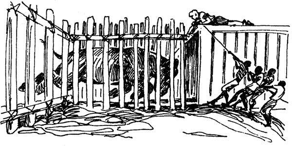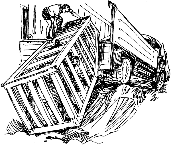 Он задумал водворить клетку обратно в кузов при помощи вена-камины. Вена-камина – своего рода стальные тали; два человека приводят их в действие, поочередно налегая на большой рычаг; вена означает «ты», камина – «я». Осборн продел трос под клетку, и вена-камину прикрепили к толстому дереву перед грузовиком; одновременно группа рабочих подпирала клетку снизу короткими вагами.
