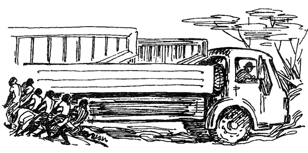 Возле указателя с надписью «Миссия и больница Мери-Маунт» мы увидели трясущийся по дороге местный автобус, и эта картина напомнила мне английскую провинцию субботним утром. Затем после долгой езды добрались до Ньямахобоко, где почему-то сразу три африканские лавчонки, крытые рифленым железом, с цементными ступеньками, выстроились в ряд под солнцем посреди буша. На одной – большая реклама кока-колы, на другой – такая же реклама хабли-бабли, у третьей – поперек стены огромный красно-белый плакат: «Кончил дело – закури сигарету „Лайф“». Перед магазинами прогуливались куры; сидевшие на солнышке африканцы воззрились на нас. Мы остановились, чтобы подождать грузовики, и я зашел в лавку с рекламой хабли-бабли, принадлежащую, как гласила вывеска, некому С. Н. Зичаво. Меня встретил запах сахара, ситца, муки, веревок, лемехов и пота.