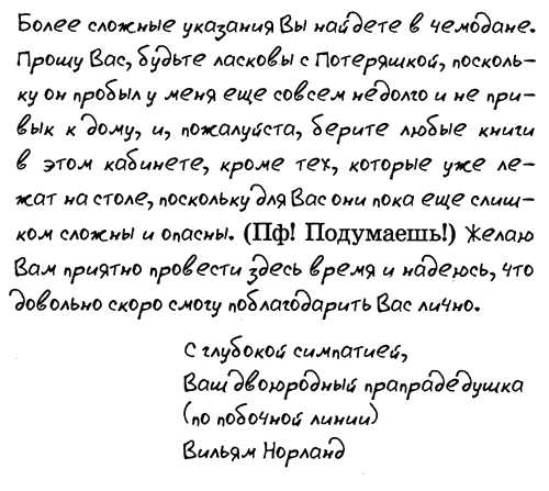 Благодарю вас за то, что Вы так любезно согласились вести хозяйство в мое отсутствие. Эльфы сообщили мне, что я должен буду пробыть у них примерно две недели. (Вот уж спасибо так спасибо, подумала Чармейн.)А возможно, и месяц, если возникнут осложнения. (Ой.)Прошу Вас, простите меня за беспорядок, который Вы обнаружите. Некоторое время я был не вполне дееспособен. Однако я уверен, что Вы находчивая юная барышня и быстро здесь освоитесь. На случай возможных трудностей я оставил Вам устные указания там, где это показалось мне необходимым. Задайте вопрос, и Вы непременно получите ответ. Более сложные указания Вы найдете в чемодане. Прошу Вас, будьте ласковы с Потеряшкой, поскольку он пробыл у меня еще совсем недолго и не привык к дому, и, пожалуйста, берите любые книги в этом кабинете, кроме тех, которые уже лежат на столе, поскольку для Вас они пока еще слишком сложны и опасны. (Пф! Подумаешь!)Желаю Вам приятно провести здесь время и надеюсь, что довольно скоро смогу поблагодарить Вас лично.
