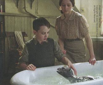 Но когда они все трое пришли к ванной, дверь в нее была открыта, а Ворчун стоял на коленях и смотрел на воду. С лысой головой и длинными усами он походил на готового окунуться моржа. Он безмолвно смотрел на маленькое животное, которое плескалось в воде, блестевшей теперь от масла. К их изумлению, дедушка широко улыбался. Ворчун, и улыбался!