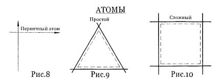Так возникают различные виды атомов, от первичных, которые просто вращаются, до атомов, в своем вращении описывающих треугольную траекторию; вид, который описывает квадрат; вид, который описывает пятистороннюю фигуру; и шестистороннюю фигуру, и т. д. (смотри рисунок 8, 9, 10).