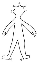 Фигура, которую нарисовала Сфера, чтобы мы могли представить себе, как выглядит Гомо Сапиенс: А – рот, Б – глаза, В – уши, Г – хватательные органы (называемые также руками, Д – органы движения (или ноги).