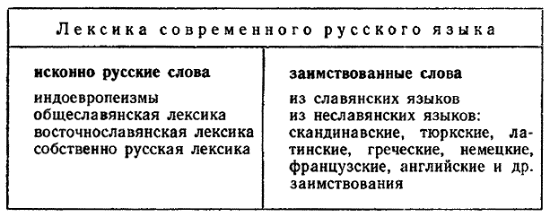Состав русской лексики с точки зрения ее происхождения можно схематично представить в таблице.
