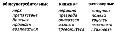 Однако дифференцирующие признаки научной, публицистической, официально-деловой лексики не всегда воспринимаются с достаточной определенностью, и поэтому при стилистической характеристике значительное количество слов оцениваются как книжные, в отличие от общеупотребительных и разговорных их синонимов. Сопоставим, например, такие синонимические ряды: