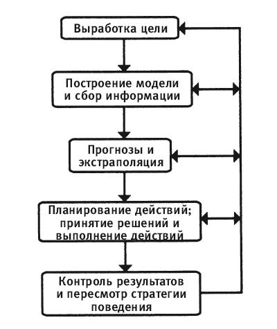 Итак, можно приблизительно представить себе стадии организации комплексных действий. Разумеется, представленный на рисунке 17 путь – это лишь схема; как правило, в реальности мы не просто переходим от одной стадии к другой. В норме человек сначала проясняет для себя цель, затем собирает информацию, предполагает вероятное будущее, планирует меры и, наконец, приходит к принятию решения, а после этого пересматривает уместность своих действий. Гораздо чаще случается так, что человек лишь на стадии сбора информации замечает, что его цели недостаточно ясны, чтобы дать ему действительно хорошие критерии для сбора этой информации. Часто только в процессе выработки линии поведения люди замечают, что информация, которую они считали достаточной, на самом деле таковой не является. Часто хорошо спланированные меры на деле оказываются неверными. Как видно на рисунке 17, между различными стадиями есть стрелки, означающие возврат назад. Фактическое планирование сложного пакета мер может состоять из многочисленных переходов туда и обратно между различными стадиями. Однако схематическое изображение стадий на рисунке 17 не описывает фактически протекающий процесс, которым занимаются реальные люди; оно лишь облегчает нам представление об этом процессе. Пять показанных на нем стадий – это возможное и, как мне кажется, рациональное разделение различных требований, которые сложная ситуация предъявляет к тому, кто хотел бы составить себе представление о правильных действиях и правильных мерах в этой ситуации. Стадии на рисунке содержат в себе задачи, которые нужно решить. В следующих главах мы подробно опишем, как именно их нужно решать и как на самом деле люди с этим справляются.