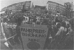 Шагая во главе колонны, всякий раз, когда появлялась возможность, я обращался через мегафон к молодым полицейским, призывал их воочию убедиться, какая пропасть пролегает между «галереей ужасов», которую рисует их начальство, расписывая поведение Демонстрантов, и реальной действительностью – наши Действия были ненасильственными, поведение – дисциплинированным. «Не позволяйте своему руководству подстрекать вас. Мы не банда погромщиков, а такие же трудящиеся, как и вы, которым езда на трамвае становится не по карману. В течение пяти дней вы сами видели, кто жаждет крови». Первым начал шеф полицейской команды Б., грубо вырвавший камеру из рук фотокорреспондента. Это было заснято на пленку одной внештатной телегруппой, и мы могли демонстрировать публике этот сюжет.
