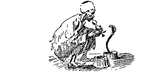 Во время завтрака на веранде появился седой полуголый фокусник, или, как их принято называть, факир, с неизбежной круглой корзиной, в которой находилась кобра, и шкатулкой с «волшебными» атрибутами. Усевшись на корточки около балюстрады, он расстегнул ремешки на круглой корзине, достал из-за пояса дудочку и заиграл какую-то грустную и протяжную мелодию. Вдруг крышка на корзине зашевелилась, откинулась, и из корзины поднялась на хвосте большая темная очковая змея. Она раздула свой капюшон с белым рисунком, напоминающим пенсне, и начала покачиваться в такт музыке, устремив свой взгляд в глаза дрессировщика. Факир то ускорял, то замедлял темп, покачивался сам, и страшная змея вторила его движениям, строго следуя такту мелодии.