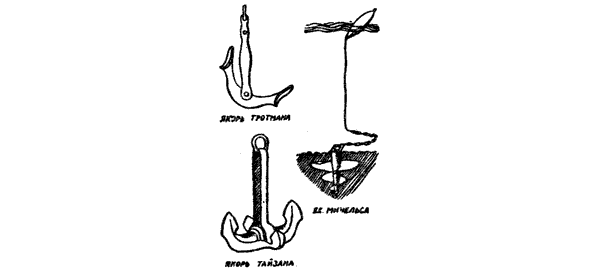 Якорь – кованый металлический снаряд, служащий для остановки судна путем сцепления его с дном моря. Якоря бывают разных систем. Два якоря, всегда готовые к отдаче и находящиеся на носу корабля, называются становыми; кроме них есть один-два запасных, хранящихся поблизости. Малые якоря, служащие для перетягивания судна с места на место путем завоза, называют верпами. Самый тяжелый верп называется стоп-анкером.