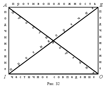 Рассмотренные отношения между простыми сравнимыми суждениями изображаются схематически с помощью логического квадрата (рис. 32), который был разработан ещё средневековыми логиками: