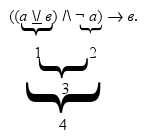 Формализуем рассуждение: «Он учится в 9 классе, или в 10 классе, или в 11 классе. Однако, известно, что он не учится ни в 10, ни в 11 классе. Следовательно, он учится в 9 классе». Выделим простые высказывания, входящие в это рассуждение и обозначим их маленькими буквами латинского алфавита: «Он учится в 9 классе (a)», «Он учится в 10 классе (b)», «Он учится в 11 классе (c)». Первая часть рассуждения представляет собой строгую дизъюнкцию этих трёх высказываний: a ∨ b ∨ c. Вторая часть рассуждения является отрицанием второго: ¬b, и третьего: ¬c, высказываний, причём эти два отрицания соединяются, т. е. связаны конъюнктивно: ¬ b ∧ ¬ c. Конъюнкция отрицаний присоединяется к упомянутой выше строгой дизъюнкции трёх простых суждений: (a ∨ b ∨ c) ∧ (¬ b ∧ ¬ c), и уже из этой новой конъюнкции как следствие вытекает утверждение первого простого суждения: «Он учится в 9 классе». Логическое следование, как мы уже знаем, представляет собой импликацию. Таким образом, результат формализации нашего рассуждения выражается формулой: ((a ∨ b ∨ c) ∧ (¬ b ∧¬ c)) → a. Эту логическую форму можно наполнить любым содержанием. Например: «Впервые человек полетел в космос в 1957 г., или в 1959 г., или в 1961 г. Однако, известно, что впервые человек полетел в космос не в 1957 г. и не в 1959 г.. Следовательно, впервые человек полетел в космос в 1961 г.» Ещё один вариант: «Философский трактат «Критика чистого разума» написал то ли Иммануил Кант, то ли Георг Гегель, то ли Карл Маркс. Однако, ни Гегель, ни Маркс не являются авторами этого трактата. Следовательно, его написал Кант».
