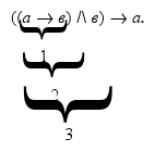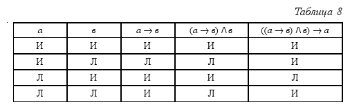 Рассмотрим ещё один пример. Требуется формализовать следующее рассуждение и установить, к какому виду относится выражающая его формула: «Если какое-либо здание является старым, то оно нуждается в капитальном ремонте. Это здание нуждается в капитальном ремонте. Следовательно, это здание старое». Выделим простые высказывания, входящие в это рассуждение: «Какое-либо здание является старым», «Какое-либо здание нуждается в капитальном ремонте». Первая часть рассуждения представляет собой импликацию: a → b, этих простых высказываний (первое является её основанием, а второе – следствием). Далее, к импликации присоединяется утверждение второго простого высказывания, и получается конъюнкция: (a → b) ∧ b. И наконец, из этой конъюнкции вытекает утверждение первого простого высказывания, и получается новая импликация: ((a → b) ∧ b) → a, которая и является результатом формализации рассматриваемого рассуждения. Чтобы определить вид получившейся формулы, составим табл. 8 её истинности.
