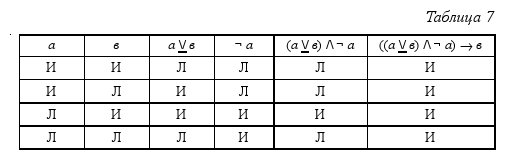 Для того чтобы определить, к какому виду относится та или иная формула, и, соответственно, оценить логическую верность какого-то рассуждения, обычно составляют специальную таблицу истинности для этой формулы. Рассмотрим следующее рассуждение: «Владимир Владимирович Маяковский родился в 1891 г. или в 1893 г. Однако известно, что он родился не в 1891 г. Следовательно, он родился в 1893 г.». Формализуя это рассуждение, выделим входящие в него простые высказывания: «Владимир Владимирович Маяковский родился в 1891 г.». «Владимир Владимирович Маяковский родился в 1893 г.». Первая часть нашего рассуждения, несомненно, представляет собой строгую дизъюнкцию этих двух простых высказываний: a ∨ b. Далее к дизъюнкции присоединяется отрицание первого простого высказывания, и получается конъюнкция: (a ∨ b) ∧ ¬ a. И, наконец, из этой конъюнкции вытекает утверждение второго простого суждения, и получается импликация: ((a ∨ b) ∧ ¬ a) → b, которая и является результатом формализации данного рассуждения. Теперь надо составить табл. 7 истинности для получившейся формулы: