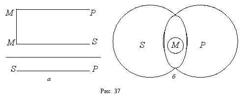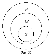 Прямые линии на схеме (за исключением той, которая отделяет посылки от вывода) показывают связь терминов в посылках и в выводе. Поскольку роль среднего термина заключается в том, чтобы связывать больший и меньший термины силлогизма, то на схеме средний термин в первой посылке соединяется линией со средним термином во второй посылке. Схема показывает, каким именно образом средний термин связывает между собой другие термины силлогизма в его первой фигуре. Кроме того, отношения между тремя терминами можно изобразить с помощью кругов Эйлера. В данном случае получится следующая схема (рис. 35):