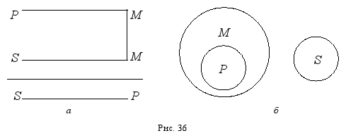 Схемы взаимного расположения терминов и отношений между ними во второй фигуре силлогизма выглядят так (рис. 36):