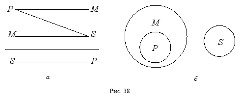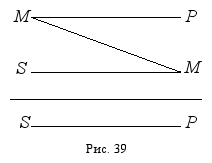 Прежде всего надо найти субъект и предикат вывода, т. е. меньший и больший термины силлогизма. Далее следует установить местоположение меньшего термина во второй посылке и большего – в первой. После этого можно определить средний термин и схематично изобразить расположение всех терминов в силлогизме (рис. 39):