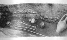 Одежда погребенного, конечно, истлела совершенно и до нас не дошла. Только на одном бронзовом украшении сохранились незначительные остатки какой-то ткани. Зато украшения все оказались в могиле на месте. Около правого виска лежала серьга в виде маленького колечка из золотой проволочки, среди костей грудной клетки – две большие черные гешировые бусины, две бронзовые бусины, несколько маленьких бронзовых фибул и бронзовый прорезной колокольчик. На кости левой руки был падет бронзовый браслет, а в районе тазовых костей оказались Рассыпанными мельчайшие круглые бляшки для нашивки, вероятно украшавшие когда-то пояс погребенного.