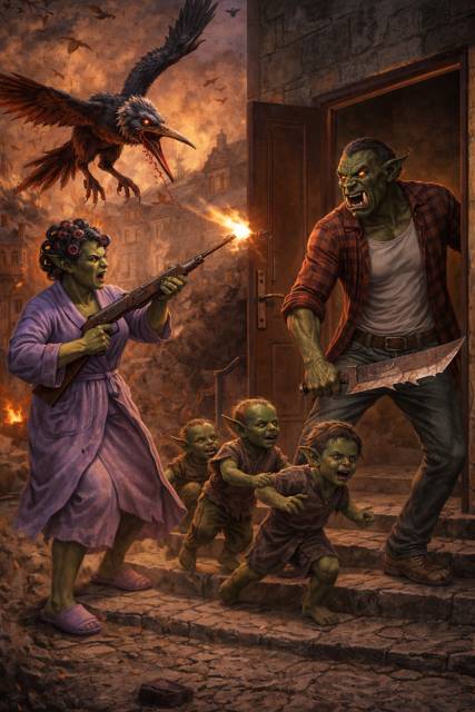 Время вдруг растянулось резиной. Старушка и ее ухажер медленно-медленно шли к открытому подъезду, из которого им так же медленно махал рукой какой-то снага. Его жена, в домашнем халате, в тапочках и бигуди, садила в небо из карабина, прикрывая детей, бегущих с улицы. Снага-муж оскалил клыки и встал с тесаком на изготовку. Цапля-кровосос плавно пикировала с неба, увидев выводок зеленокожих детишек, еле-еле бредущих к подъезду.