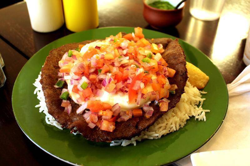 Далее было «Сильпанчо». И тут всё сложно. На большое блюдо выкладывают слой отварного риса и картофеля, сверху – тончайшую, отбитую в лепёшку говяжью котлету, обжаренную в панировке. На мясо кладут ломтики жареного картофеля и щедро посыпают свежим луком, помидорами и петрушкой.