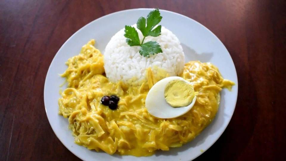 Потом мы ели «Ахи-де-Гальина». Тушёная и измельчённая курица в густом сливочном соусе на основе жёлтого перца ахи-амарильо, молока, хлеба и грецких орехов. Подаётся с отварным картофелем и рисом. Цвет – тёплый, солнечно-жёлтый. Вкус – бархатный, с приятной остринкой и ореховыми нотками.