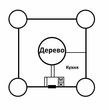 Недалеко от зоны готовки стоит большой стол на большое количество людей. За ним огромный шкаф полный всякого-разного. У южной стены, которая напротив кухни, стоят два дивана со столиком. Также у восточной стены была дверь с выходом на веранду, которую пока не построили. Ну и всё.