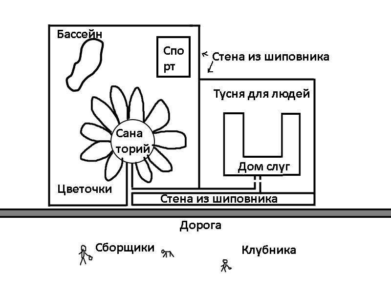 Комнаты шибко маленькими не делали, всё же людям здесь жить и работать. Так что нужно сделать все удобства. Ну а также я огорожу это место стеной из шиповника. И не только дом для работников, но и санаторий.