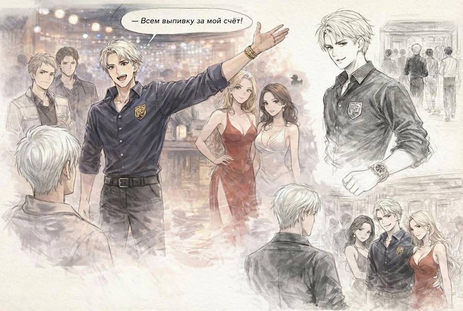 А во главе этой компании был он… Сафонов… Герцог был одет в тёмно-синюю рубашку с гербом на левой груди, чтобы все знали, что он герцог. Также были свободные чёрные штаны и дорогие золотые часы на руке. Явно с Земли. Волосы белые, но не короткие.