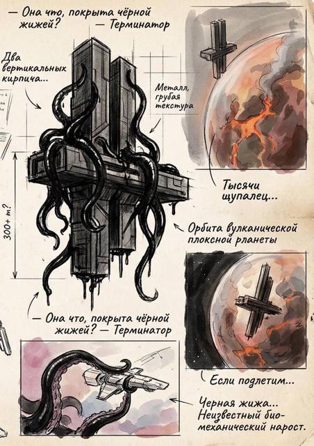 А сейчас всё это пожиралось Гнилью… То тут, то там из чёрных пятен на металле тянулись чёрные щупальца. Ещё здесь находились два транспортных корабля. Небольшие и очень старые. Оба были покрыты чёрной биомассой.