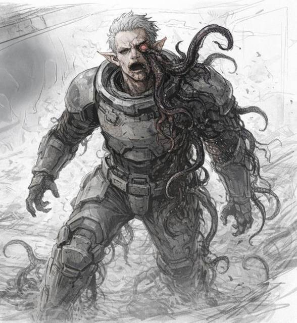 Главное же не это, а щупальце, торчащее из левого глаза, рот же шевелился, но звука из него не исходило. Сам же ксенос… У него был крохотный нос, длинные острые уши, почти как у эльфов из аниме, квадратная челюсть и слегка выпирающий лоб.