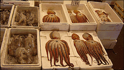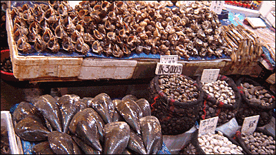 Будучи в Сеуле, я отправился на рыбный рынок Норанджин. Обычно, когда по нашему телевидению показывают восточные рыбные рынки, создается впечатление невероятного изобилия форм морской жизни, разнузданной щедрости океанической природы. На самом деле всё так и есть. Чего там только не было! Из рыб знакомыми оказались лишь скумбрия да лосось с камбалой. А так – разнообразные – толстые, тонкие, развесистые, желтые, красные, серебристые. Морские скаты, тунцы, черти, ангелы, демоны! Всё это плавает в аквариумах, лежит стройными рядами на прилавках, тут же чистится, нарезается тонкими ломтиками, продается. Горы моллюсков размерами от рублевой монеты до небольшой дыни. Морские гребешки, устрицы, ропаны, улитки, мидии. Какие–то склизские морские шашлыки на вертелах. Иногда совсем невероятное – зеленые трубочки, из которых свисают зеленые мешочки. Грозди каких–то морских шишек. Груды вообще непонятно чего. Бочки икры. Бочонки с заквашенной мелкой рыбешкой для кимчи. Сушеная рыба, начиная от полуторамиллиметровых мальков и до огромных трещщин. Кальмары, осьминоги, каракатицы. Морские огурцы–голотурии. Что–то продолговатое, розовое, извивающееся. Акулы.