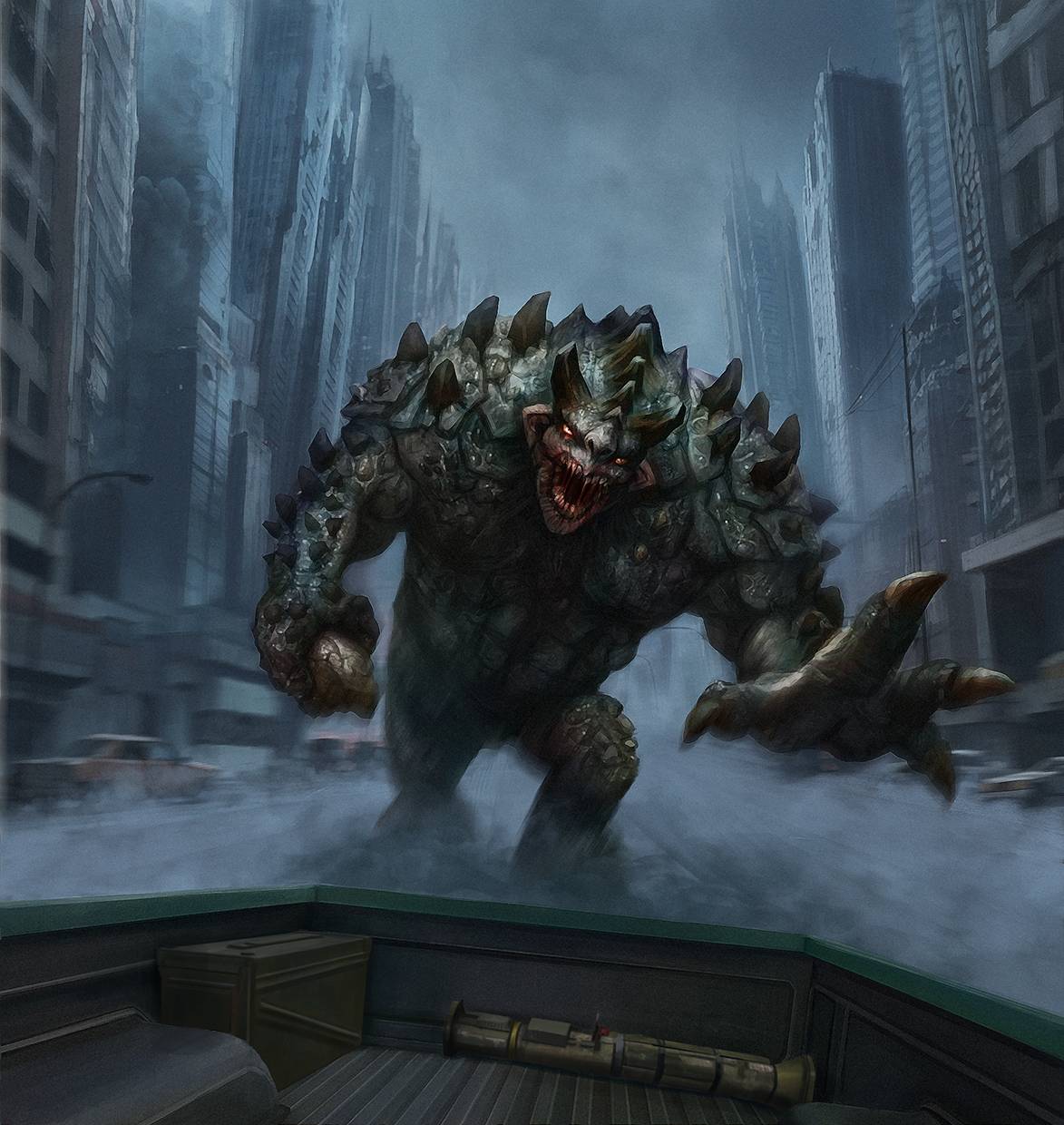 Перед ними стояла настоящая гора. Гуманоидный мутант, сутулый, крайне широкий, с ручищами почти до земли. Человека в нем ничего не напоминало, костяная голова-клюв и тело облепленное истресканными наростами-камнями. Первое слово, которое приходило на ум при его виде это «мощь». Существо явно могло ровнять небольшие бетонные дома как ребенок песочный замок. Его дыхание больше походило на работу промышленного насоса по откачке воды из затопленных помещений. Увидев это существо вживую и так близко, на расстоянии каких-то 50 метров, троица бандитов во главе со следопытом невольно замерла, лишь на лице Туза это зрелище вызывало звенящее желание, словно мечта, до которой рукой подать.