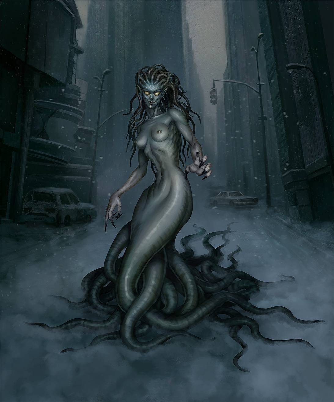 Ведомый желанием неизвестной природы убедиться в том, что никто из группы Фрэнка больше никогда и ни в каком виде не подаст признаки жизни, вымазанный кровью человек ковылял к арке. Его руки, грудь и волосы смотрелись ужасающи после того, где они побывали и с чем контактировали. Глупая кровавая ухмылка каннибала и холодный взгляд непременно вызвали бы мурашки у прохожего. Сжимая в кулаке свой нож-пиранью Вик настиг кабриолет и стал вонзать лезвие в горло и без того мертвого Тощего. Лезвие было слишком коротким для отсечения, поэтому оно просто делало ситуацию грязнее и отвратительней. Спустя несколько минут этого глупого и бессмысленного занятия Туз краем глаза заметил, что он не один. Со стороны улицы, где произошла авария, к удивлению убийцы на него смотрели два больших желтых глаза. Он одернувшись замер и рассмотрел незваного участника кровавого пира. Это оказалась та самая мутантка, что поймала его возле центрального парка. Только сейчас она была полностью открыта взгляду. Её человеческая половина тела уже была прекрасно видна в прошлый раз. Но сейчас можно было разглядеть огромный хвост медузы Горгоны с поправкой на многочисленные подвижные отростки. Человек не придумал ничего лучше, чем улыбнуться мутанту. Из-за боли в спине улыбка получилась специфичная, с оскалом. Но он без капли страха смотрел на некогда пощадившую его тварь.