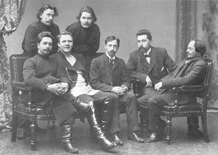 Первый ряд слева направо: Леонид Андреев, Федор Шаляпин, Иван Бунин, Николай Телешов, Константин Пятницкий. Второй ряд: Скиталец (Степан Петров), Максим Горький. 1902 г.