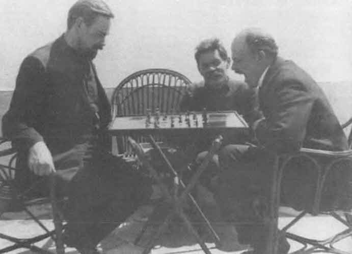 Горький наблюдает за шахматной игрой Ленина и Александра Богданова.