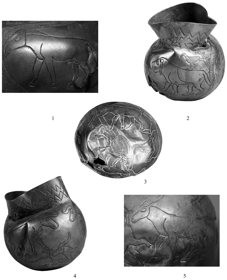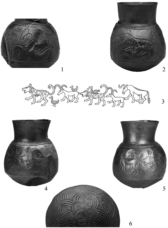 Рисунок 4. 1, 2, 4, 5 – сосуд с розеткой на дне, 6 – орнамент на дне сосуда (3 – проекция на плоскость изображений животных на тулове). Середина – конец 4 тыс. до н. э. Россия. Серебро. Майкопский курган (курган Ошад). Инв. № 34/95. Фото А. М. Кокшарова © Государственный Эрмитаж, Санкт-Петербург, 2018