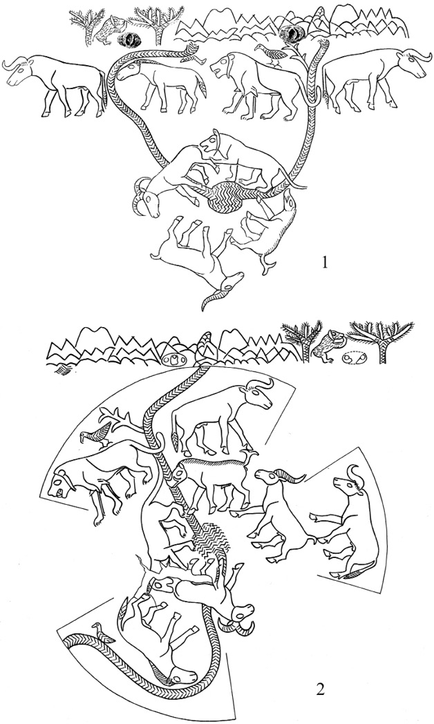 Противостоящие быки на первый взгляд одинаковы, симметричны и равноправны. Однако рядом косвенных признаков отмечена фигура левого, ближайшего ко льву быка (рис. 1: 4). Только фигуры льва и этого быка находятся полностью под изображением гор; голова быка, так же как голова льва, находится точно под одной из двуглавых вершин; фигура этого быка в длину несколько превышает фигуру другого. Противостоящий бык (рис. 1: 5), соседствующий с преследуемым жеребцом, изображен так, что тело его находится под изображением дерева (обозначающим предгорные леса) и лишь голова оказывается под оконечностью горного пейзажа. Создается впечатление, что первый бык как бы защищает область у подножия гор и главной священной горы, а второй бык как бы вступает в эту область.