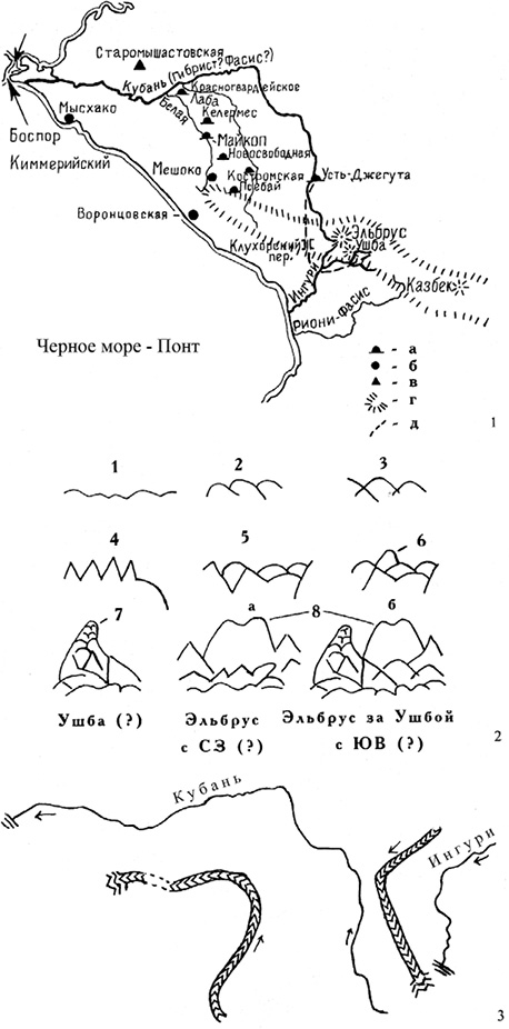 Рисунок 3. 1 – карта с обозначением упоминаемых в статье географических пунктов: а, б, в – памятники Майкопской культурной общности (а – погребения; б – поселения; в – клады; г – хребет Большого Кавказа (свыше 2 км); д – примерный путь, соединяющий две точки, откуда виден Эльбрус с противоположных сторон); 2 – варианты изображения гор на сосуде с «пейзажем»; 3 – сопоставление Кубани и Ингури с двумя реками, изображенными на сосуде с «пейзажем»