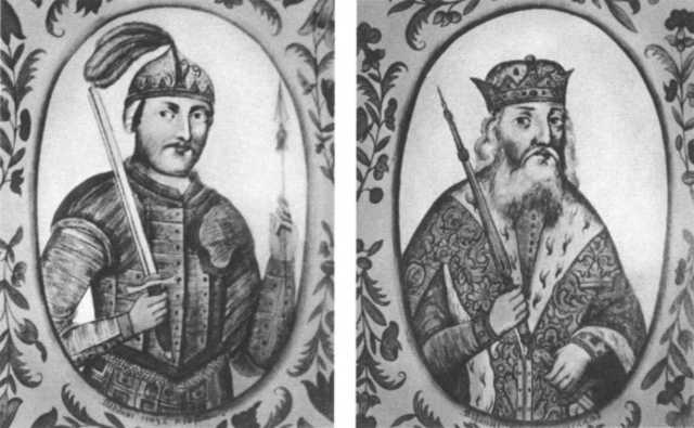 Князья Игорь (слева) и Святослав (справа). Портреты из «Титулярника» 1672 г. Можно предположить, что портреты князей в «Титулярнике» перепутаны местами.