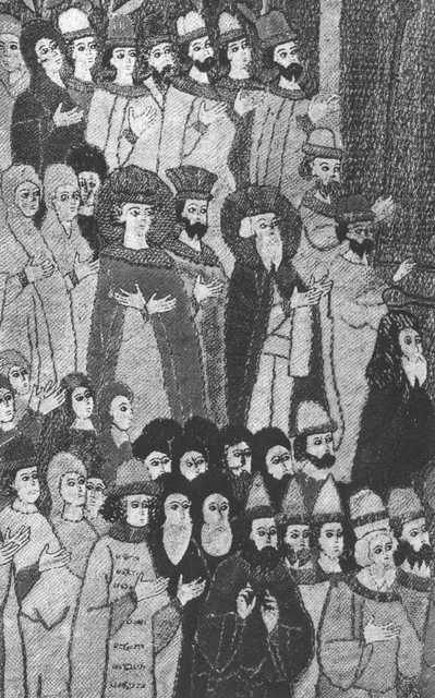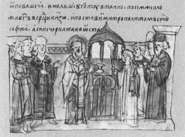 Поставление Илариона на митрополию. Миниатюра Радзивиловскои летописи.