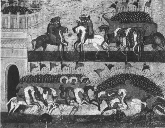 Битва новгородцев с суздальцами. Фрагмент иконы «Чудо от иконы Божиеи Матери Знамения в Новгороде». 1460-е гг.