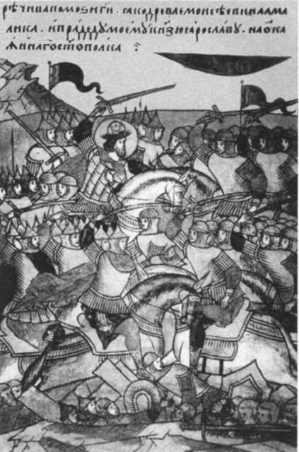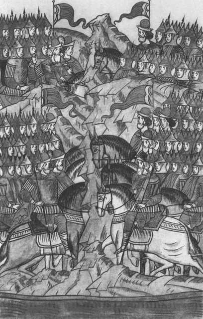 Поход князя Игоря Святославича на половцев. Миниатюра Радзивиловскои летописи.